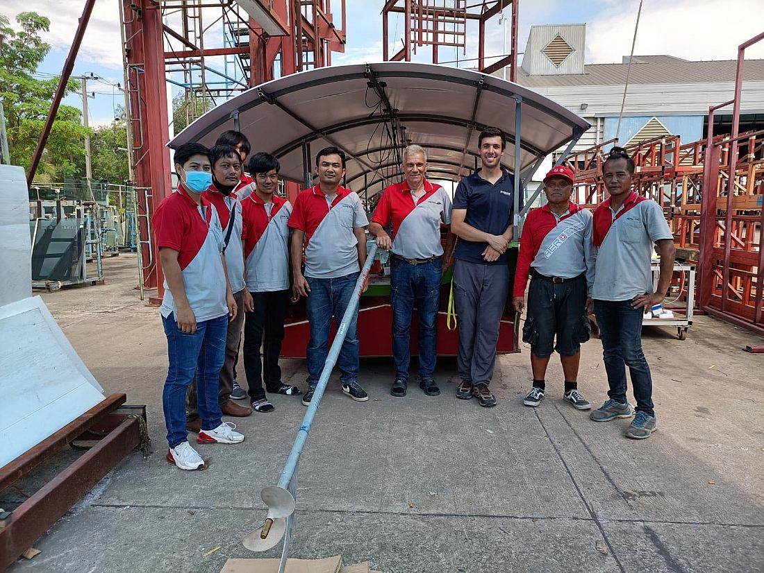 Martin Mathis arbeitet konstant im Unternehmen und baut KYBURZ Thailand auf. Inzwischen ist die Produktionsstrasse fertig eingerichtet. Die ursprünglich neun Stationen, wie in der Schweiz, wurden auf drei zusammengefasst. So kann die Montage der ersten Vorführ-Fahrzeuge mit drei thailändischen Mitarbeitern starten.