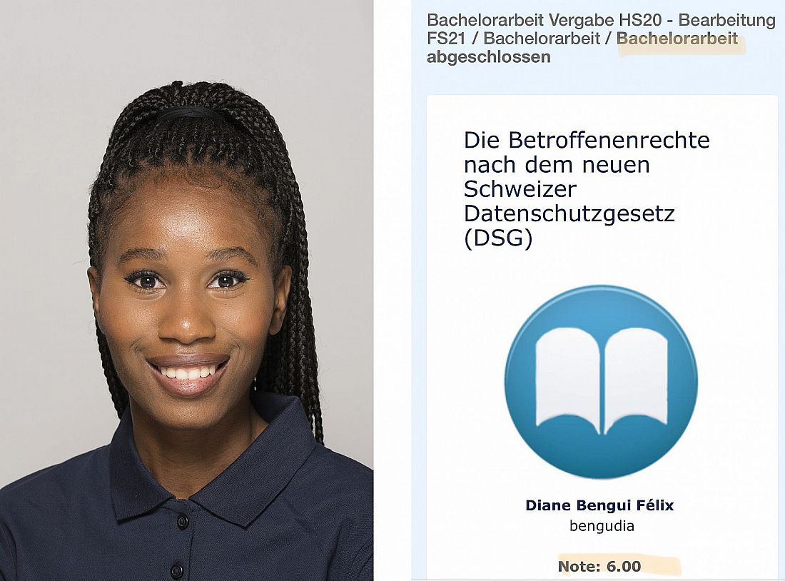 Im Rahmen ihres Studiums in Wirtschaftsrecht an der ZHAW School of Management and Law hat Diane ihre Bachelorarbeit mit dem Titel «Die Betroffenenrechte nach dem neuen Schweizer Datenschutzgesetz (DSG)» geschrieben. Ihre Arbeit wurde mit der Bestnote 6.0 ausgezeichnet. Wir sind stolz und gratulieren herzlich zu diesem Spitzenresultat!