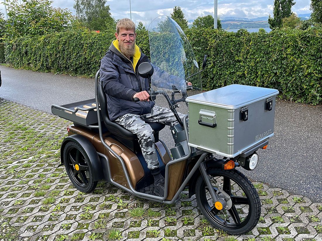 Thomas Braun hat am Freitag, 16. Juli seinen langersehnten KYBURZ DXS in Sahara braun geliefert bekommen. Thomas Braun leidet an einer Autoimmunkrankheit. Da die Krankheit von der IV nicht gelistet ist, bietet die IV keine Unterstützung. Herr Braun hat selbständig die Finanzierung über verschiedene Stiftungen organisiert. Nun freut er sich über die gewonnene Mobilität für Käufe des täglichen Lebens, weitere Ausflüge mit dem Hund, der in der Hundebox auf dem grossen Warenkorb hinten mitfährt sowie auch Ausflüge in die Region.