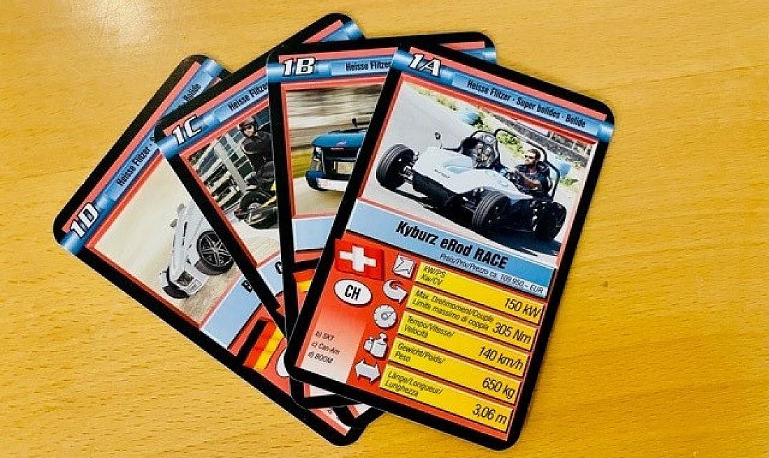 Spielst du gerne und bist ein Fan von 4 Rädern? Dann ist das «Fun & Drive» Quartett von Ravensburger genau das richtige für dich. In diesem Quartett gibt es sogar eine Karte mit unserem KYBURZ eRod Race.