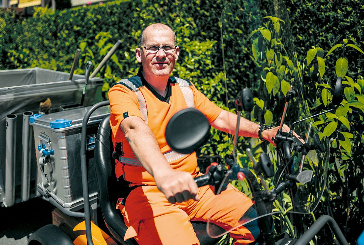 Das Revier von Christian Gaillard ist fünf Kilometer lang, reicht von der Ortschaft Clarens über Montreux bis zum Port de Territet. Die Uferpromenade am Genfersee ist ein Publikumsmagnet. “Während meiner Reinigungseinsätze fege ich die Gehwege und leere auch knapp 100 “Abfallhaie“, die schweizweit bekannten Abfallbehälter. Früher war ich mit einem einachsigen Karren, also zu Fuss unterwegs. Der KYBURZ DXS erleichtert mir nun die Arbeit sehr, ich komme schneller voran, dafür ist mein Einsatzgebiet jetzt grösser geworden. Im Winter gibt es auf der Promenade weniger zu tun als im Sommer.“