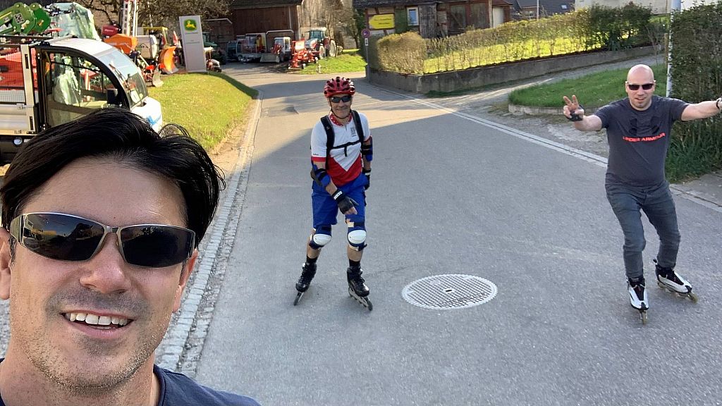 The enterprising ones: Dani, Abel and Rolf set off from Freienstein in their cars at 16.30 on Tuesday, 30.3.21. In Oberglatt at the "Flughafengrill Parkplatz", the inline skates were strapped on and off we went.
