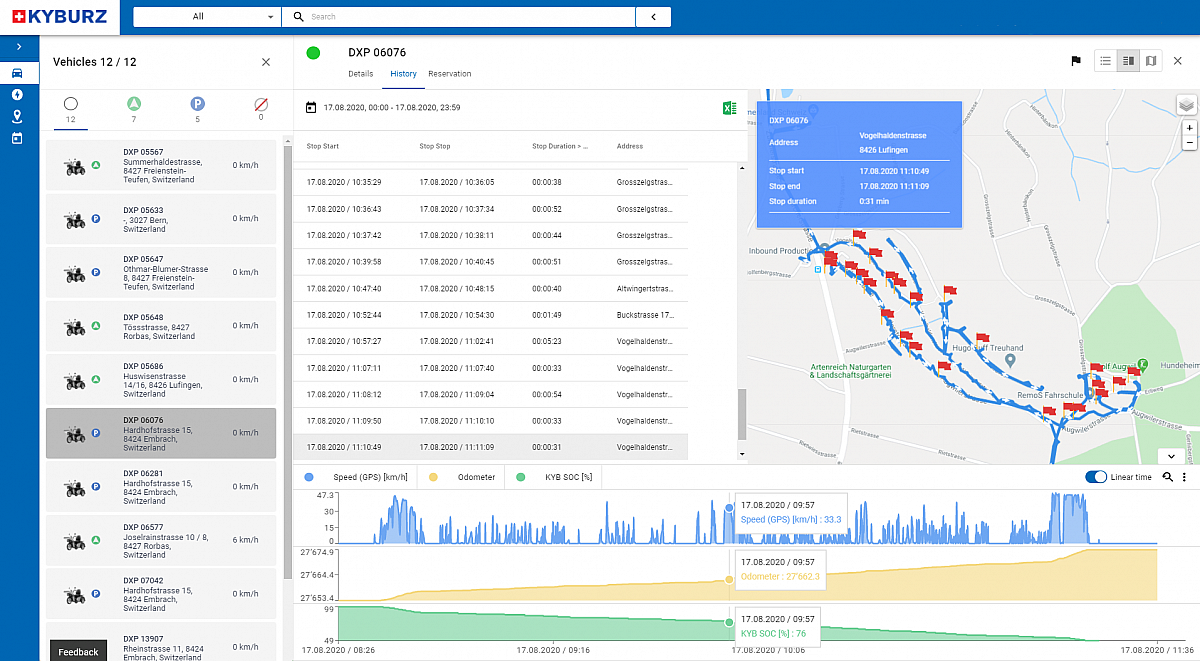 The diagnostic tool from KYBURZ Fleet enables detailed analysis of trips and vehicle parameters. All variables recorded by the Fleet-Box, such as speed, energy consumption, current, battery charge level, battery and engine temperature, or error codes can be displayed synchronously on the map, as line graphics, and in tabular form. Error patterns that are not directly visible on the vehicle can be immediately identified in the line graphic as a typical pattern.