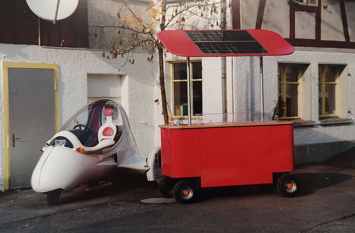 Mes 15 voitures seniors construites étaient toujours là et nous avons donc décidé d'engager Markus Frey comme vendeur. Entre-temps, au printemps 1995 et nous nous sommes inscrits à une foire commerciale pour les personnes âgées. Comme prix de vente nous avons fixé CHF 9'900 pour notre véhicule senior. J'ai installé le stand. Une fois encore, j'ai dû utiliser le stand que j'avais déjà emprunté à mon ancien voisin au Salon de l'automobile de Genève. Je ne voulais pas être présent sur le stand. Je ne me considérais pas comme un vendeur et il y avait beaucoup à faire avec le Solar Eis.