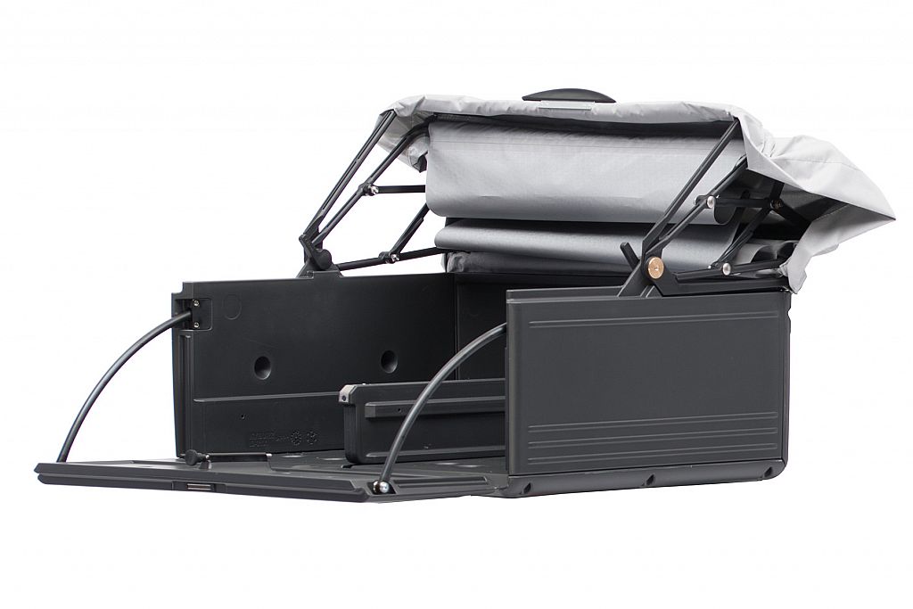 Les parois à double paroi et le fond du box sont fabriqués en France. Un tube en polypropylène est gonflé dans un moule jusqu'à ce qu'il ait la forme souhaitée. Les supports de la housse textile, qui peuvent être verrouillés dans différentes positions, sont fabriqués en Suisse à l'aide d'une technologie de moulage par injection.