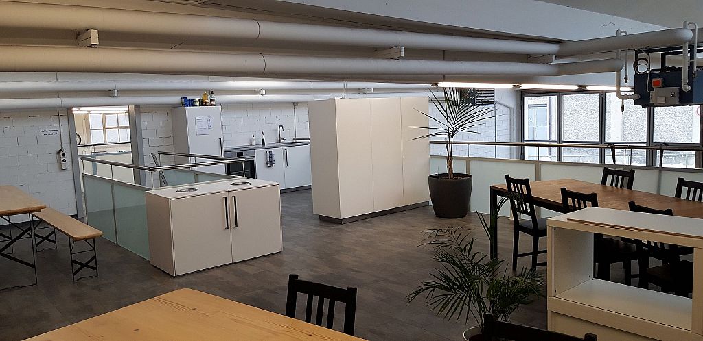 Comme une dizaine de personnes partagent la table du déjeuner chaque jour, l'atelier de la mezzanine devenait de toute façon un peu exigu. Sans plus attendre, la cuisine a été déplacée dans son nouvel emplacement et est maintenant séparée de l'atelier.