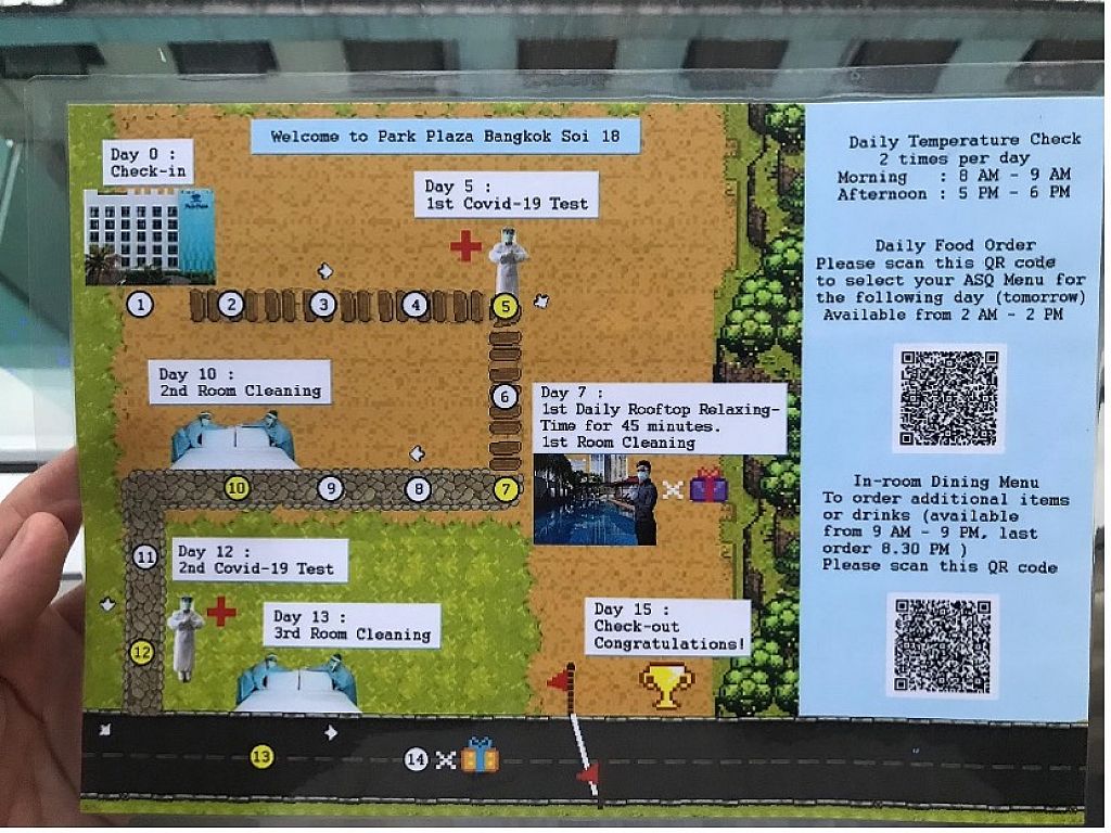 Arrivé à l'hôtel tout se passe de maniètre très stricte, les chaussures doivent être désinfectées et on enfile alors des tongues en plastique. La chambre est très moderne et agréablement meublée. De l'eau, des boissons (sans alcool) et des en-cas sont fournis en abondance. Mais il est étonnant que l'on ne soit autorisé à quitter la chambre pour la première fois qu'après sept jours : pendant 40 minutes par jour pour aller à la piscine, mais pas dans la piscine !