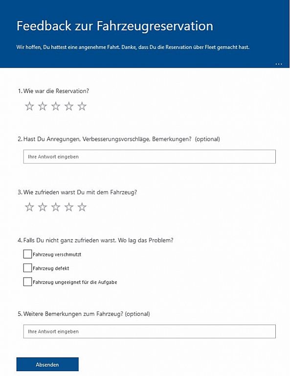 A la fin du mois de mars, vous avez reçu un e-mail contenant un lien vers un formulaire de commentaires après avoir effectué la réservation de votre véhicule dans l'outil de réservation notre départmement Fleet. Cela vous permet de rendre compte de votre expérience de la réservation et de l'état du véhicule sans trop d'efforts. L'équipe Fleet évaluera vos commentaires et organisera les améliorations éventuelles. Veuillez prendre le temps de remplir correctement le formulaire. Merci de votre aide.