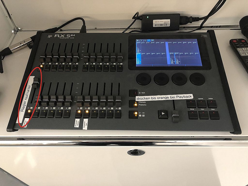 Toute la lumière est contrôlée par la table de mixage. Faites glisser le bouton vers le haut à gauche et vous avez de la lumière. Poussez-le vers le bas et il fait nuit. Vous avez beaucoup plus de possibilités. Laissez l'équipe de 2ndLife-Team vous les expliquer.