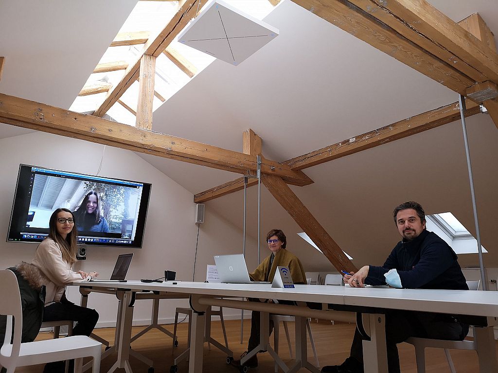 La semaine dernière a eu lieu l'installation du nouveau système de vidéoconférence dans le grenier. Le même système a récemment été installé dans notre salle de réunion "discuss" et a déjà été testé plusieurs fois. Le système Logitech et Sennheiser a déjà fait ses preuves lors de nombreuses réunions. Le microphone de Sennheiser permet une transmission du son propre et sans interférences.