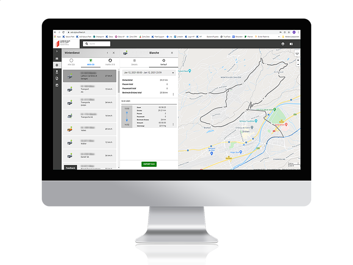 KYBURZ FLEET vous assiste pour toutes les machines et accessoires en tant que système central de maintenance hivernale, quel que soit le fabricant. Le système enregistre automatiquement et précisément les quantités de sel épandu, les distances de déblaiement et les temps de fonctionnement.