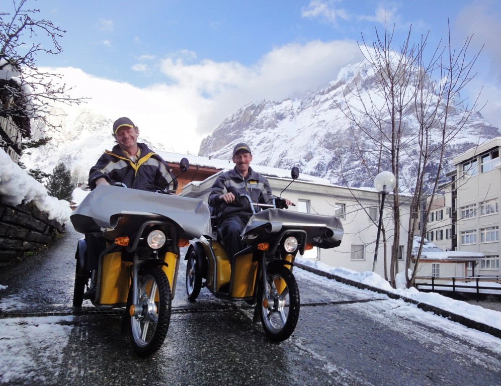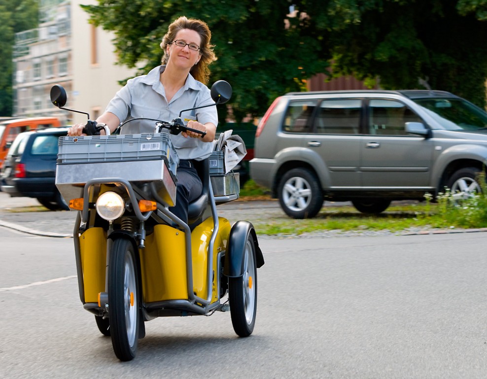 Le frein de stationnement automatique permet un maniement efficace, le postier économise du temps et ménage ses forces.