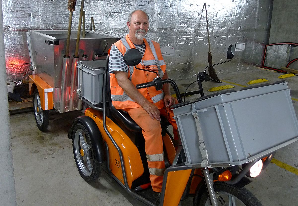 Le KYBURZ DXS orange est le "véhicule de service" de Werner Morf (57) : il vide les quelque 85 poubelles trois fois par semaine réparties sur toute la grande zone, les autres jours il est sur la route pour des opérations de nettoyage. Il parcourt environ 35 kilomètres par jour, 350 à 400 kilomètres par mois. Le soir, quand je rentre chez moi, la batterie est encore à moitié pleine. Morf n'a plus qu'à vider la grande remorque KYBURZ adaptée trois fois par jour - à la pause des 10 heures, à midi et le soir.