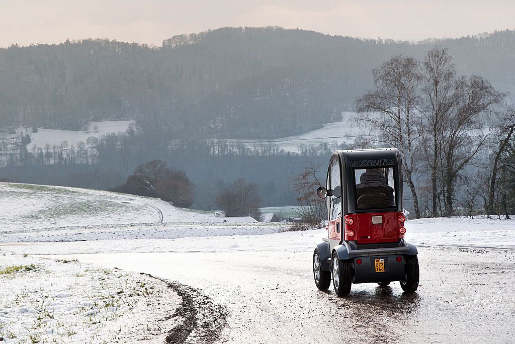Es geht hinaus auf die Testfahrt. Mit dem heftigen Schneefall wird der überarbeitete Scheibenwischer gut fertig. Schon bei den ersten Kurven fällt auf, dass die Lenkkraft etwas höher ist als beim alten PLUS. Das ist den deutlich breiteren Reifen geschuldet. Sowohl Geradeauslauf als auch der Bremsweg konnten verbessert werden. Der PLUS II liegt richtig gut in der Hand und es macht Spass, damit auf schneebedeckter Strasse Richtung Irchel zu fahren. Bis 18% Steigung bewältigt das Fahrzeug problemlos. Die winterlichen Verhältnisse erfordern ein sanftes Abbremsen. Mittels der Rekuperationsbremse, die nur auf die Hinterachse wirkt, gelingt dies problemlos. Sind Notbremsmanöver unumgänglich, so bremse ich über die Handbremse. Dir Kraft wird über die elektrische Servobremse verstärkt an alle 4 Räder übertragen.
