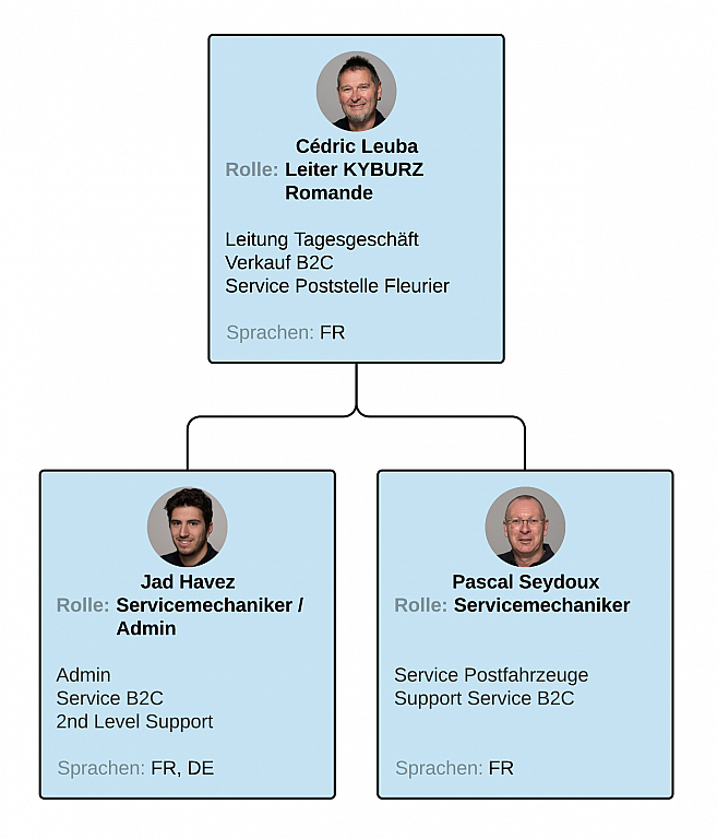 Die Koordination liegt zentral in der Verantwortung von Cédric Leuba, der neben dem Verkauf an Privatkunden und dem Unterhalt einer lokalen Fahrzeugflotte der Schweizerischen Post alle KYBURZ-Aktivitäten in der Westschweiz betreut.