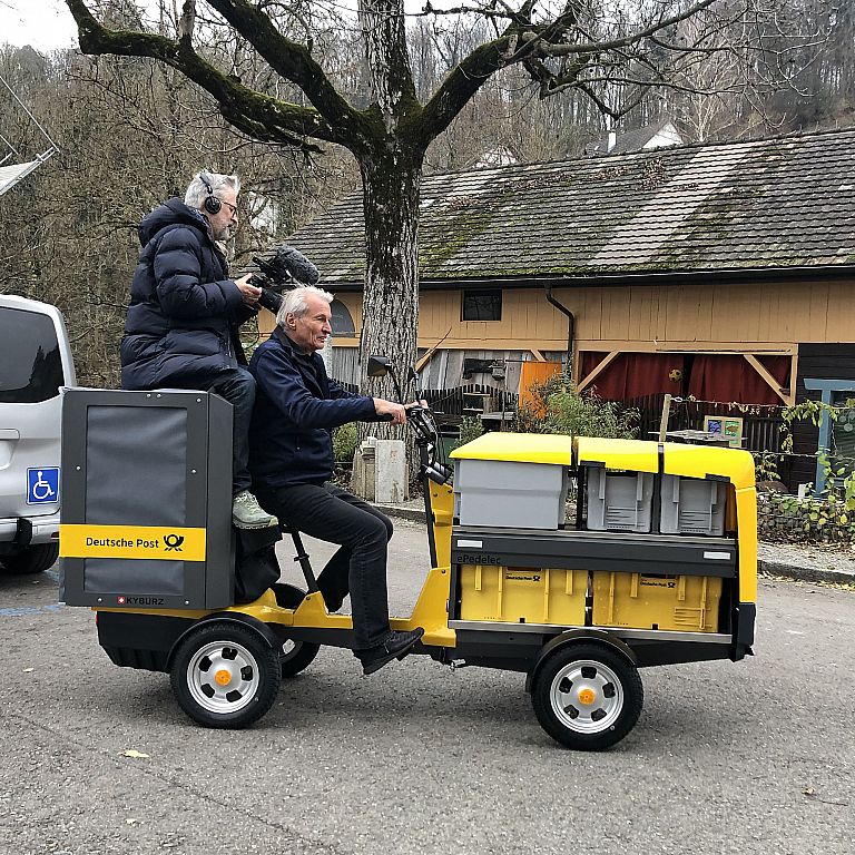 «Time to market» war das Schlagwort für die zeitnahe Erstellung des Video-Clips. Der Kurzfilm sollte die Produktionswerkstatt, die Nutzung als Postzusteller, aber auch die verschiedenen Möglichkeiten bereits vorhandener Aufbauten dem Zuschauer aufzeigen. Martin Schnelli hatte sich spontan bereit erklärt, als Monteur in der Werkstatt aufzutreten. Hans-Peter liess es sich nicht nehmen, mit klein wenig Stolz das Gefährt durch die Strassen von Freienstein zu fahren, damit Bruno (unser Video-Clip-Hofproduzent) eindrucksvolle Filmaufnahmen schiessen konnte. Dass die abgeänderte «Australienbox» auch als Sitzplatz für spektakuläre Filmaufnahmen genutzt werden kann, stand wirklich nicht im Entwicklungs-Pflichtenheft.