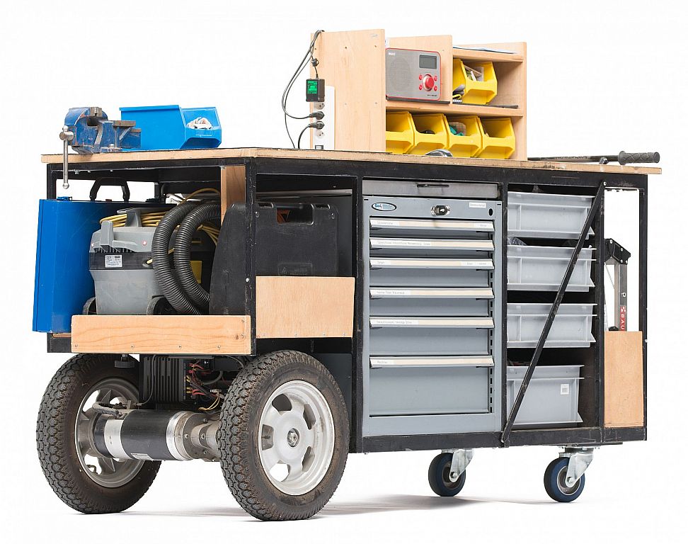 Bestimmt kennt ihr diese mobile Werkbank. Ihr seid vermutlich gefühlte tausend Mal daran vorbeigelaufen oder habt vielleicht schon etwas ausgeliehen oder deponiert. Genau, das ist der treue Begleiter von Turi. Er erleichtert seinen Tag beim Unterhalt der Infrastruktur, lässt sich einfach und ohne Aufwand von einem zum nächsten Gebäude fahren und hat immer alle notwendigen Werkzeuge mit an Bord.